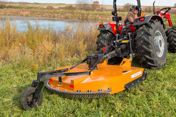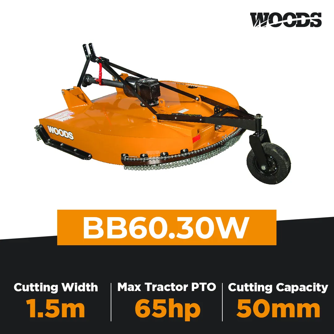 The Woods Equipment BB60.30W Brushbull Single Spindle Slasher is a medium duty single spindle slasher. It has a 1.5m (5’) cut and has a 50mm diameter cutting capacity. The maximum tractor PTO is 65hp. 3-point reinforced mounted tail wheel and front/rear chain shielding standard.