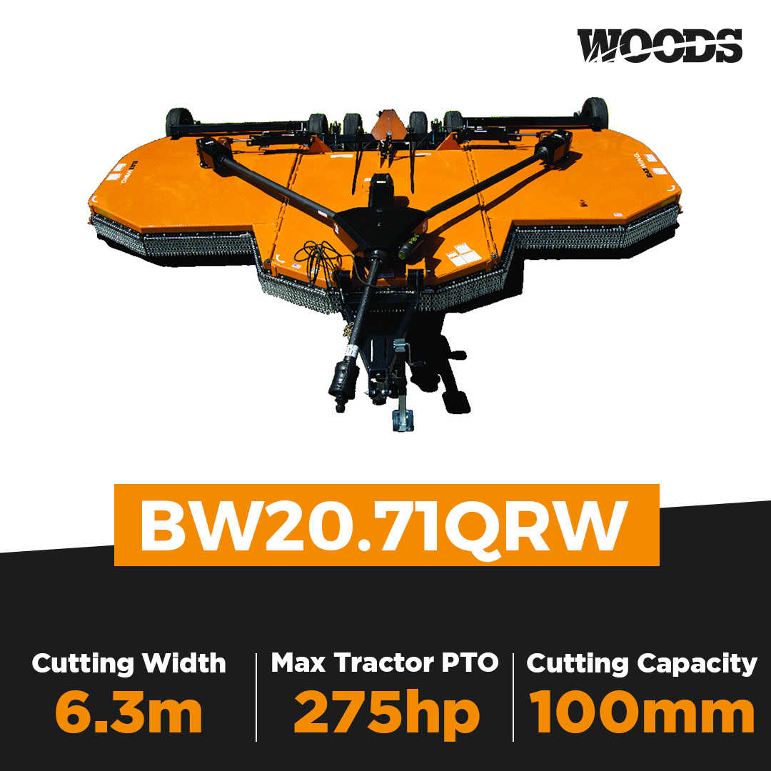 The Woods BW20.71QRW 20ft Batwing Flex Wing Slasher Series range have a standard duty, heavy duty and extreme heavy duty series for tractors with a maximum PTO horsepower of 275hp. The cutting capacity ranges from 70mm diameter material to 100mm diameter material. The flex wing operating range is 90° up and 22° down. The flex wings can be operated in the vertical position allowing for slashing over banks. The extra heavy output shaft allows the operator to cut heavier material.