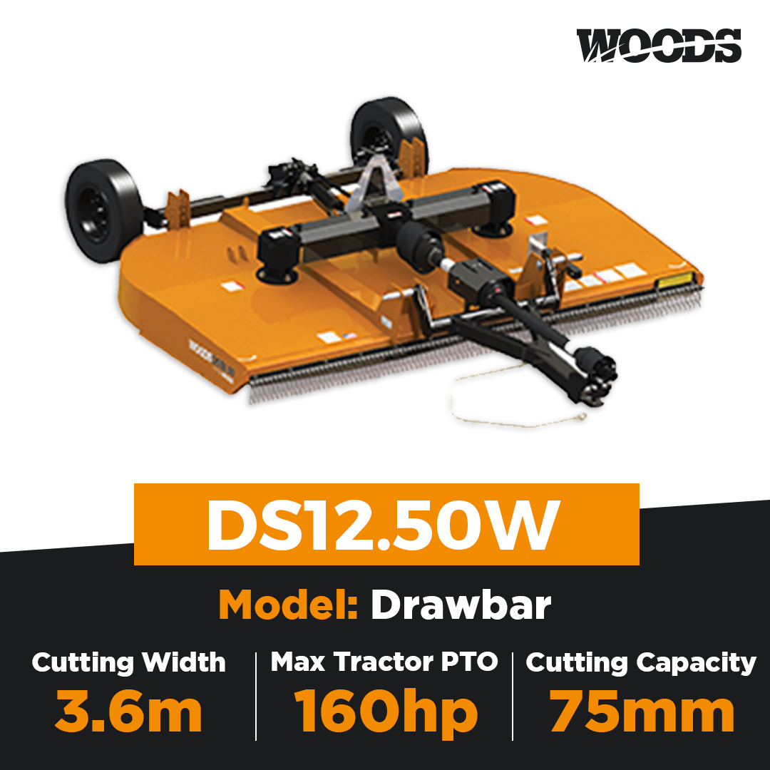 The Woods Equipment DS12.50W Dual Spindle slasher is a heavy-duty dual spindle slasher. It has a 3.6m (12’) cut and has a cutting capacity of 75mm diameter material. The splitter gearbox is 205hp and the spindle gearbox is 160hp. Dual Spindle Slashers are available in both drawbar and 3-point linkage attachment options. The DS12.50W is a drawbar attachment.\